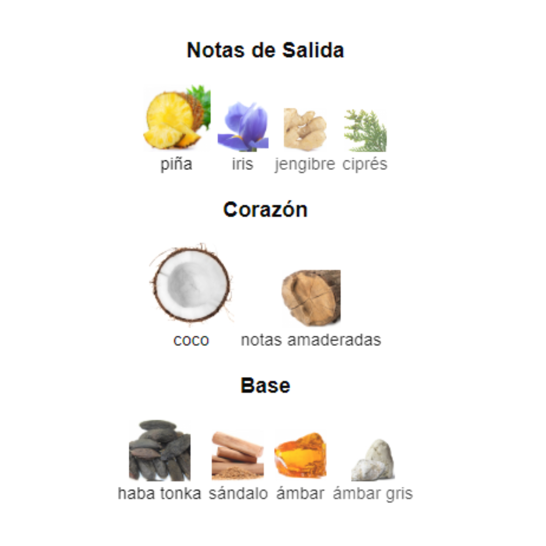 Acordes dominantes: Su perfil aromático es oriental, con un toque frutal y amaderado que le da un carácter cálido y envolvente.